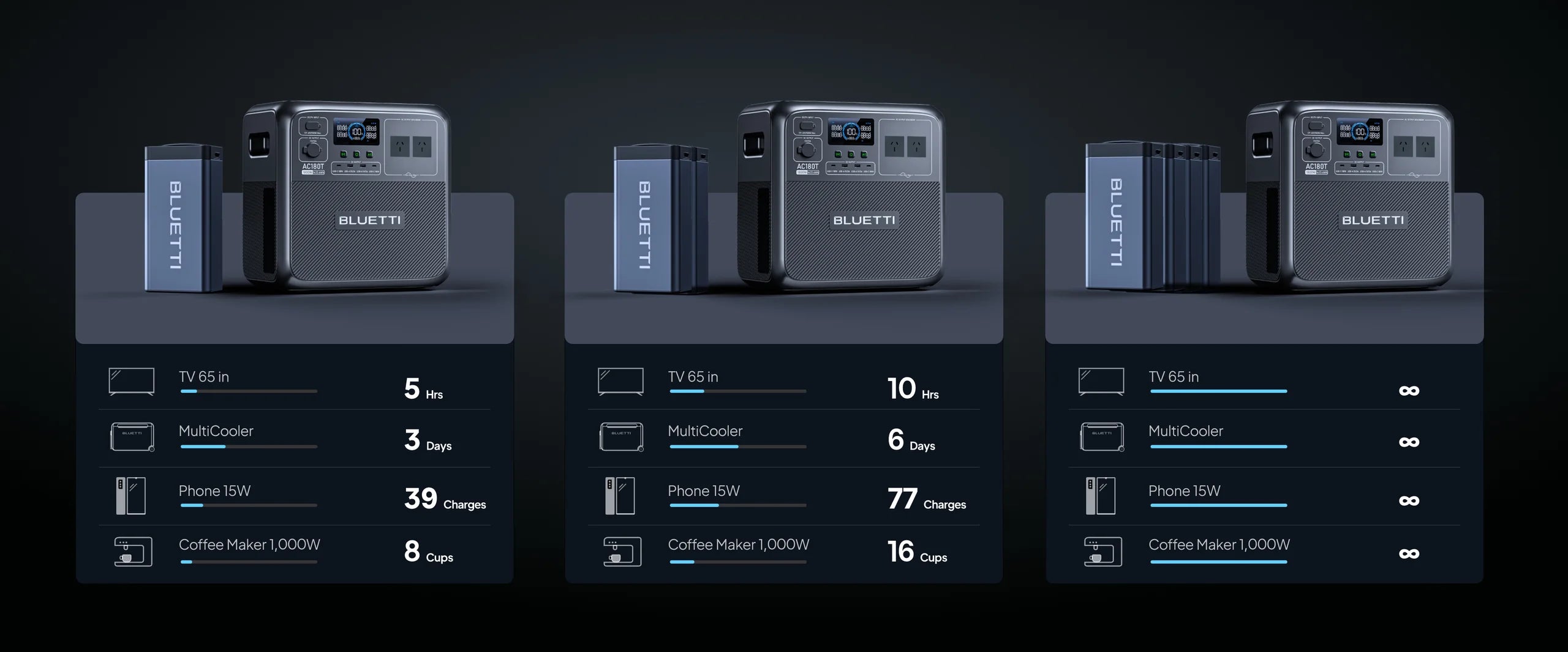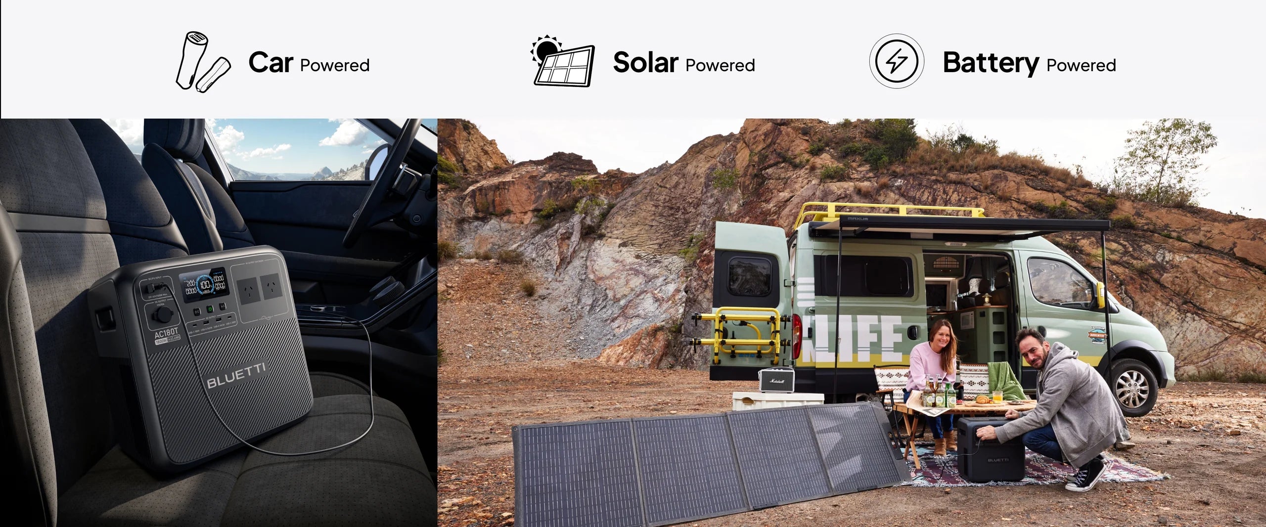 For week-long road trips or an off-grid lifestyle, BLUETTI's first ecosystem keeps your devices powered, food fresh, and drinks ice cold, all in an efficient and sustainable way. The interchangeable B70 battery fits both the AC180T and the Multicooler, offering extreme flexibility and convenience.