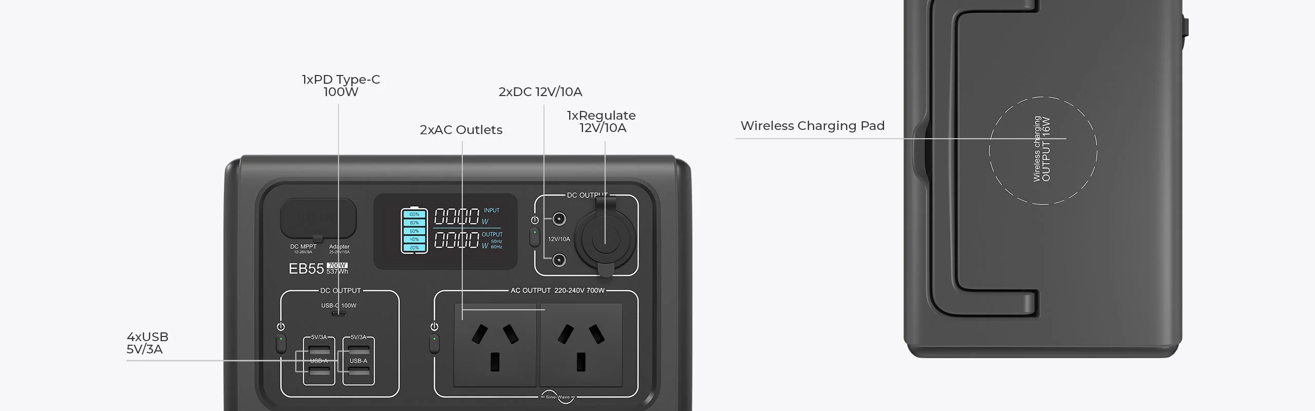 EB55 could run 11 devices simultaneously. From smartphone, to mini-fridge, you can power all your electronics with it. Especially, there are one piece of wireless charging pad.